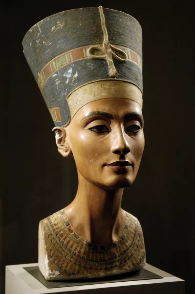 Chef-d’œuvre absolu, le masque funéraire de Toutânkhamon fait partie des œuvres emblématiques de l’art pharaonique. Posé sur la tête de sa momie, il était protégé par une série de chapelles et de cercueils emboîtés tels des poupées russes. Constitué de près de 10 kg d'or et de pierres fines, il est censé représenter le visage du pharaon. Les yeux cernés de khôl, les traits du visage fins, la barbe postiche courbe, symbole de sa divinité, les oreilles percées : il fascine par sa beauté idéale et androgyne car… ce masque était à l’origine dédié à sa demi-sœur et épouse Ankhésenamon ! Le souverain porte le némès, coiffe traditionnelle à bandes rayées bleu et or, et un collier ousekh composé de perles de pierres fines. La coiffe est surmontée de la déesse vautour Nekhbet pour la Haute-Égypte, et de la déesse cobra Ouadjet pour la Basse-Égypte.